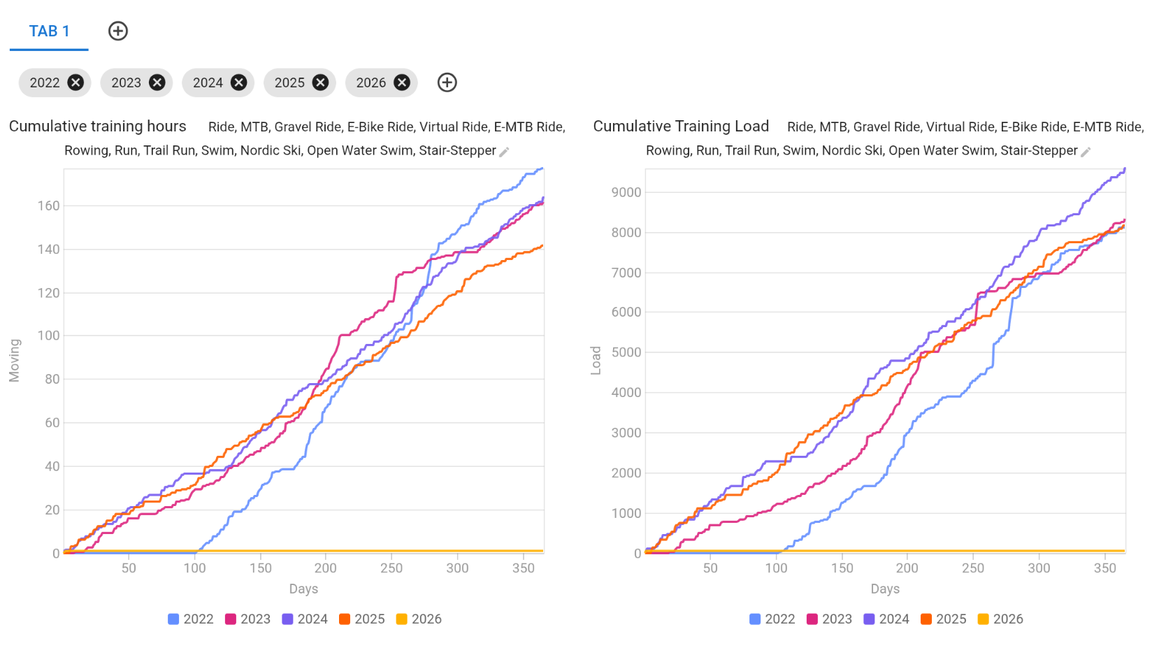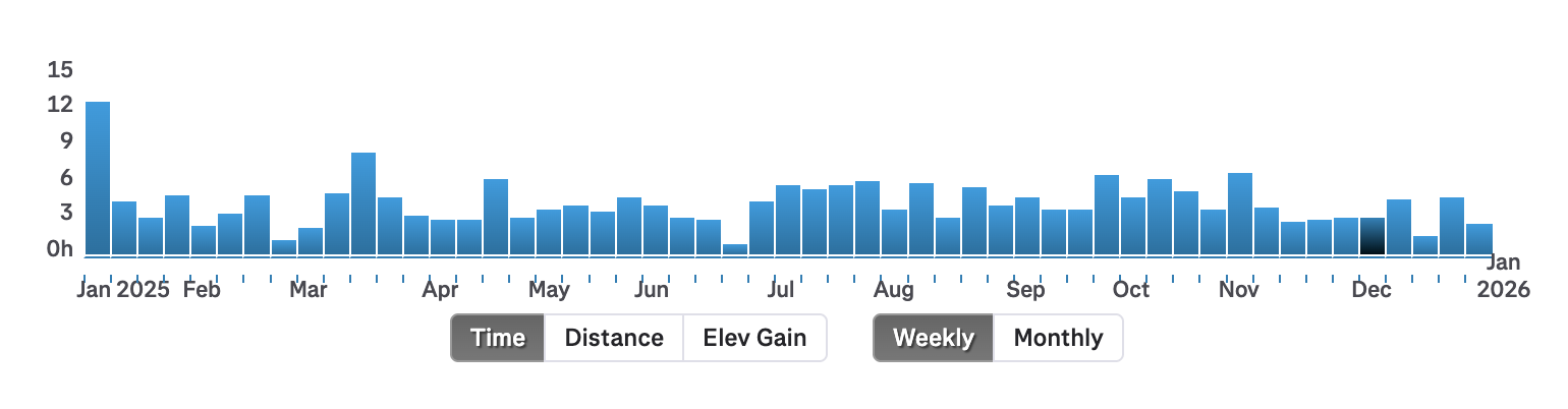 My cumulative training hours took a dip in 2025, but my overall training load was about the same.
