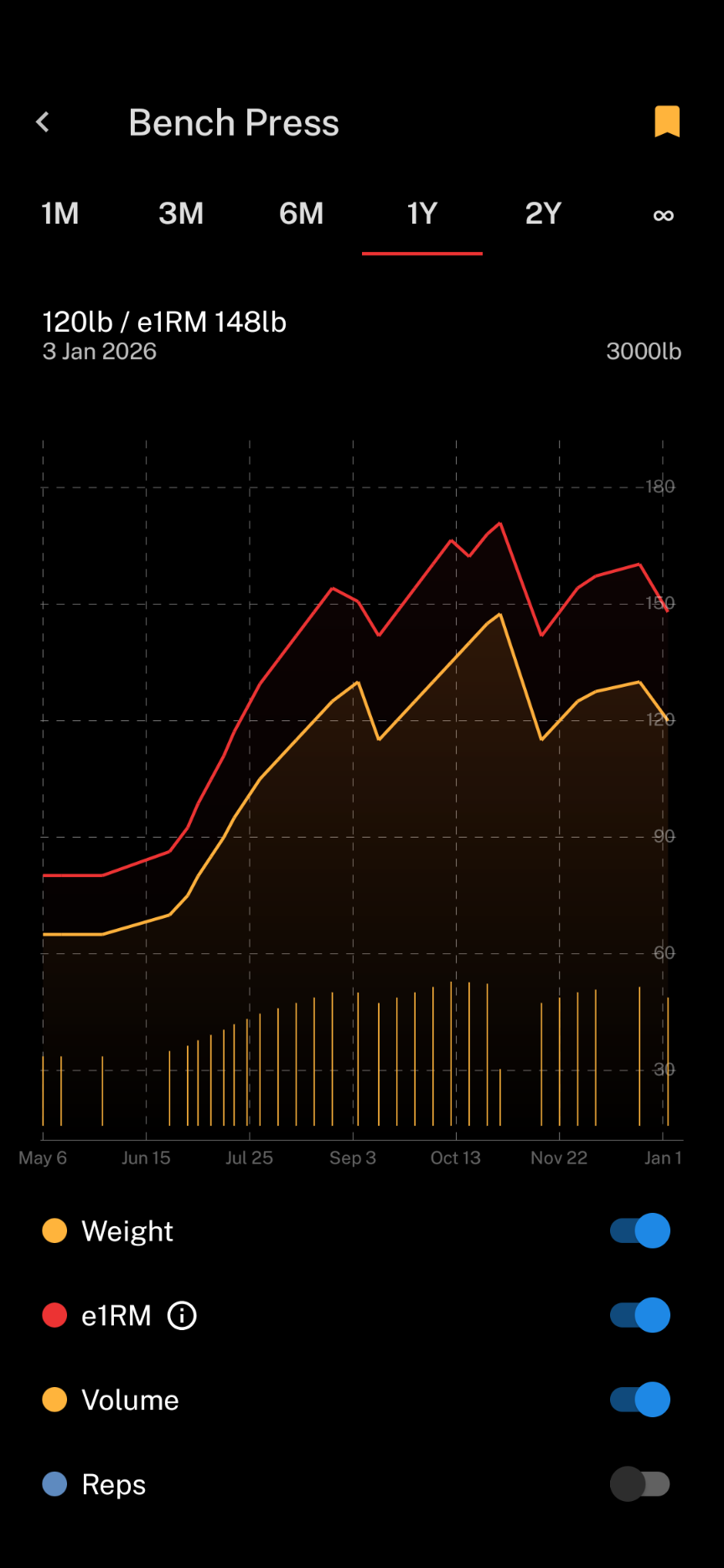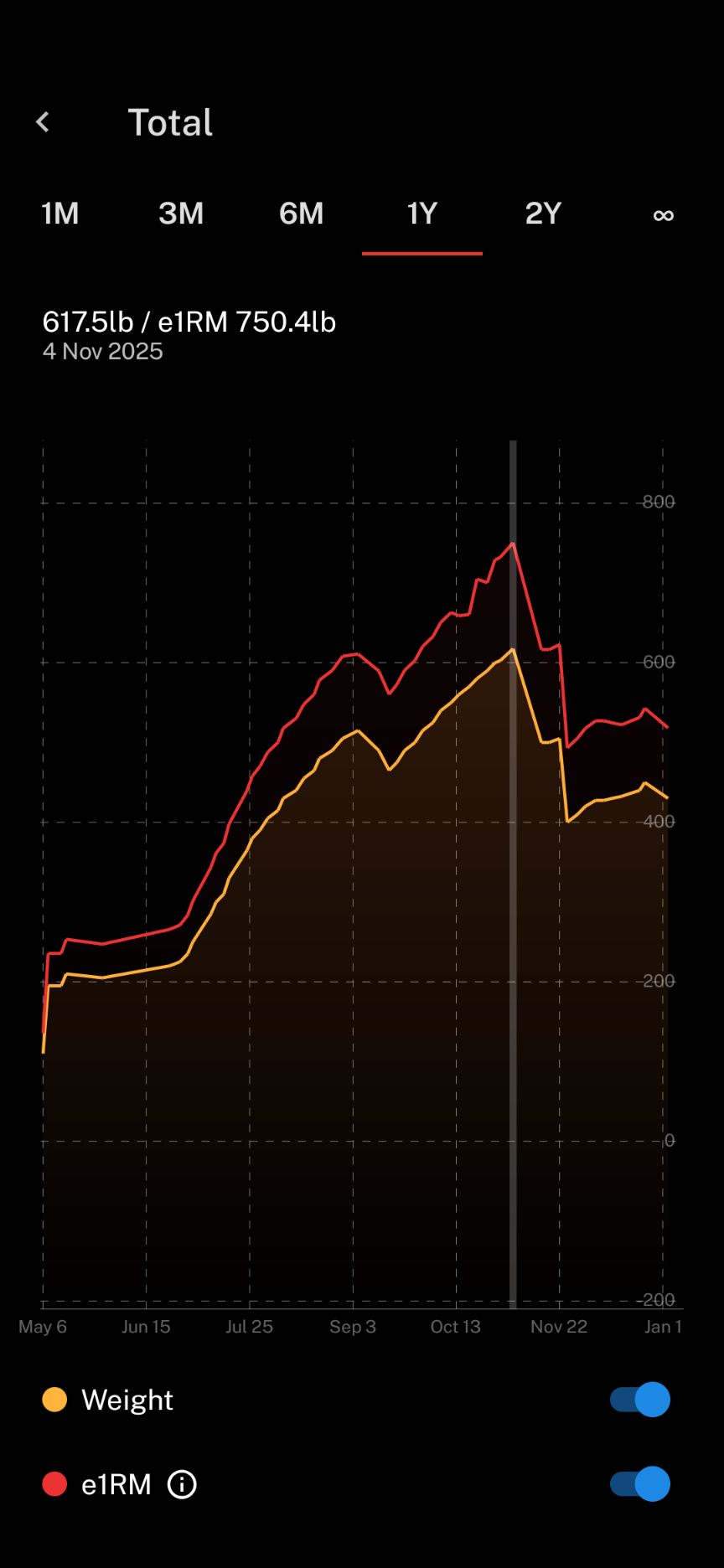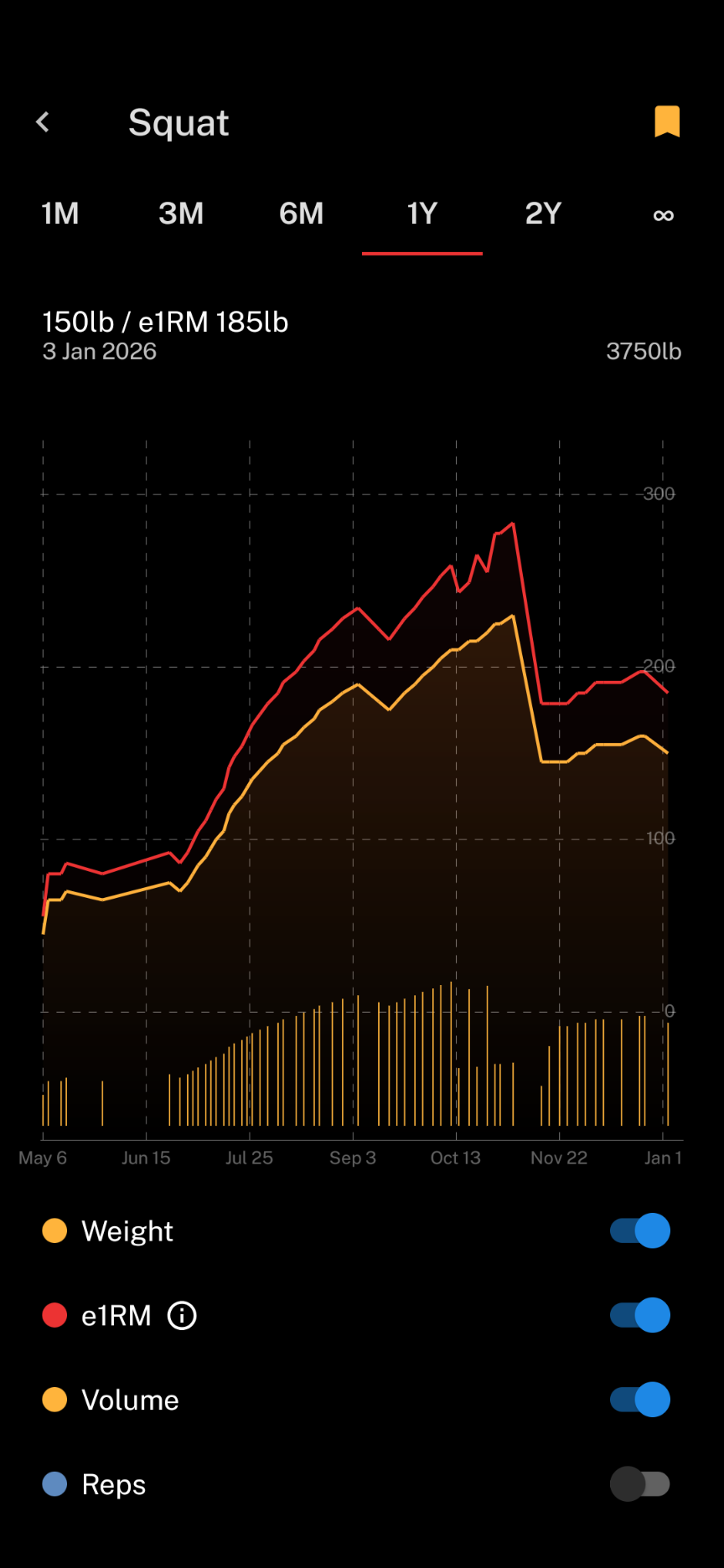 You can see from the graphs that I’m slowly building back up, and also repeating weights for multiple sessions before adding more. Slow and steady is the name of the game here.