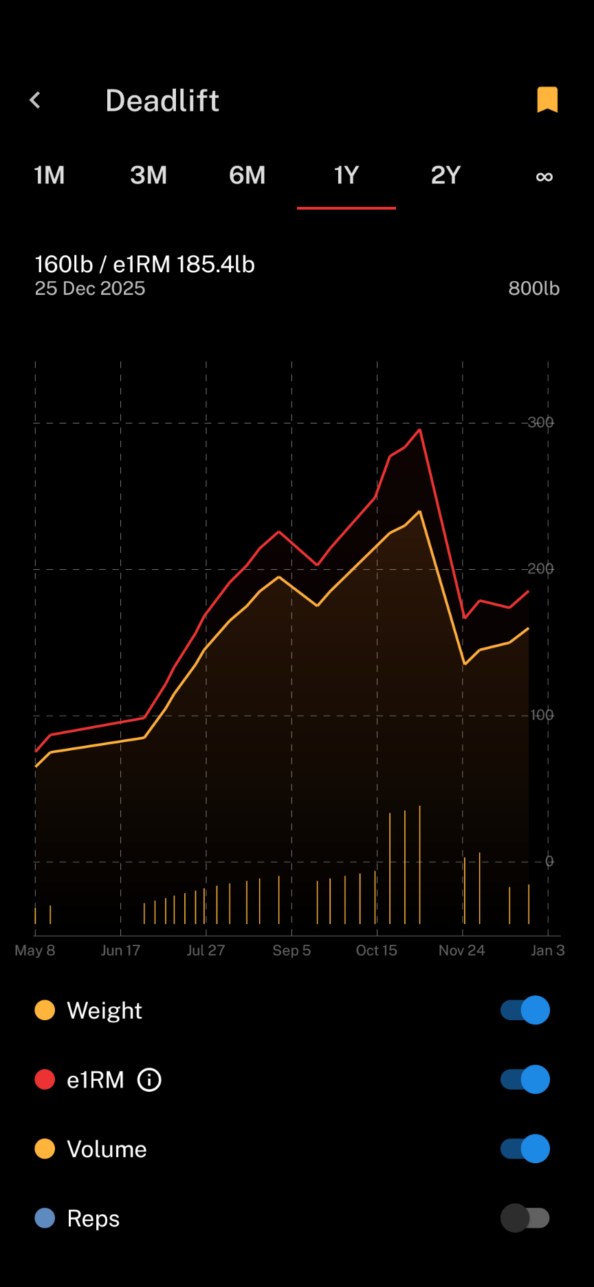 As is common, the early days of the program were fun and motivating as it was easy to make gains every session. I progressed quite steadily for multiple weeks, and then in November, as is common, I injured myself deadlifting and had a hard time even bending over for over a week. This was super disappointing, since I’ve always been able to deadlift quite heavy.