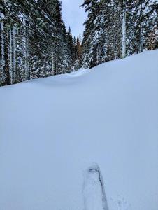 I followed my skin track back “down” the ridgeline, but there’s not actually that much elevation gain on the ridgeline, so it was slow going with all the snow.
